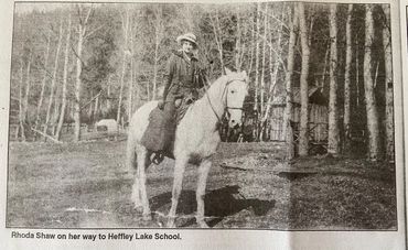 Rhoda Shaw was the first teacher for the school at Heffley Lake. She was eighteen years old when she started teaching. She rode her horse, or horse and sleigh in winter, nearly twenty kilometers per day as she commuted between the Shaw ranch where she lived to the school at the lake. Occasionally, she stayed at the McDonald homestead near the lake. It was a requirement at the time for teachers to be unmarried females. This was well known among the young men in the area, and somehow, they found excuses to meet the new teachers. As a result, there was a significant turnover of teachers. After the Heffley Lake School burnt down Rhoda taught at the McGillivray Creek School. She married Frank White Senior and they had two children. In 1942, Rhoda and Frank took over the running of the Shaw ranch. When her husband died in a horse-riding accident, Rhoda continued running the ranch but renamed it ‘Whitecroft’ in honor of her late husband. She was allowed to continue teaching due to the shortage of single women, particularly during the war years. Her daughter also became a teacher, and her son Rob became a rancher, logger, and school bus driver. He is the author of the booklet, ‘A look at Heffley Creek and the Upper Valley.’